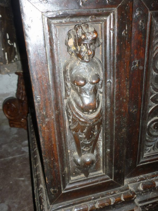 Importante Cassapanca trentina in essenza di noce; il fronte è riccamente scolpito con telamoni alle paraste e figure muliebri entro specchiature con motivi a volute, cornice del piano intagliata ad unghia.