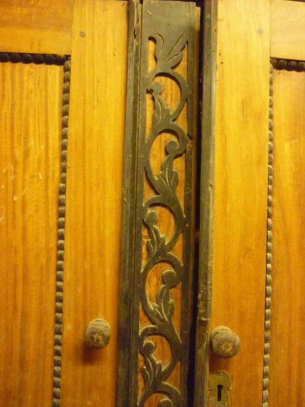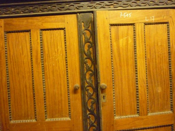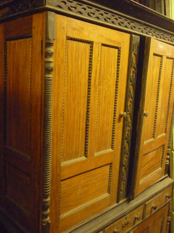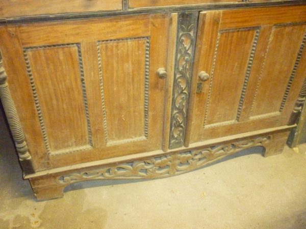 Credenza con alzata in mogano chiaro con intagli e decori in legno ebanizzato, a volute vegetali e colonnine alle estremità.