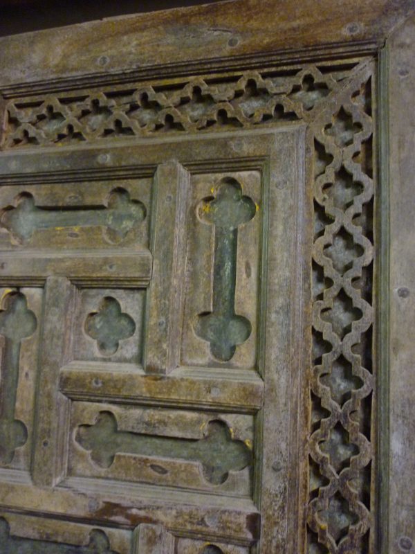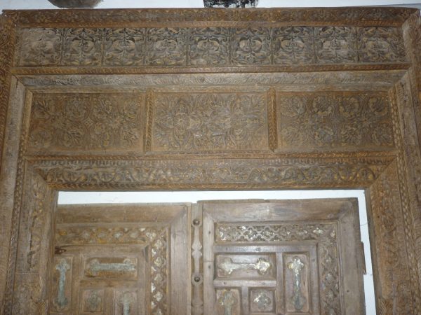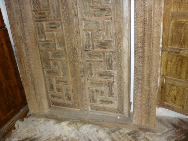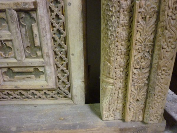 Importante portale indiano con struttura e ante in legno di tek, intagliato a motivi geometrico-floreali traforati sull’architrave e intagliati con il fondo in metallo sulle ante.La porta è a due battenti.