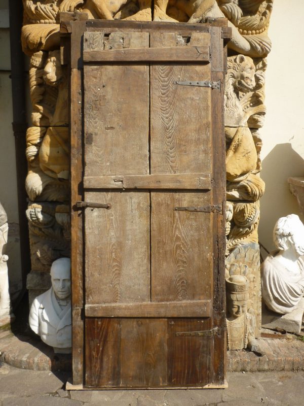 Portoncino ad anta unica con telaio, in essenza di castagno; decorato con specchiature rinascimentali a riquadri, la ferramenta non è originale ed ha subito lievi interventi di restauro, con adeguamento in altezza. Apertura a spinta a sinistra.