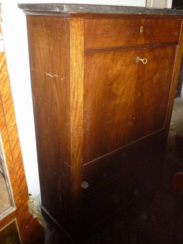 Secretaire lastronato in piuma di mogano, struttura e schiena in rovere.