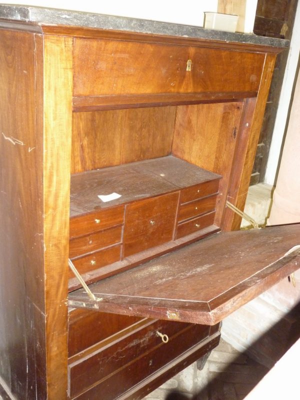 Piano in marmo nero, tre cassetti nella parte inferiore, un cassetto sopra. Lo scrittoio a ribalta è rivestito in pelle e cela all’interno sei cassettini e un portadocumenti centrale, con un capiente vano soprastante.