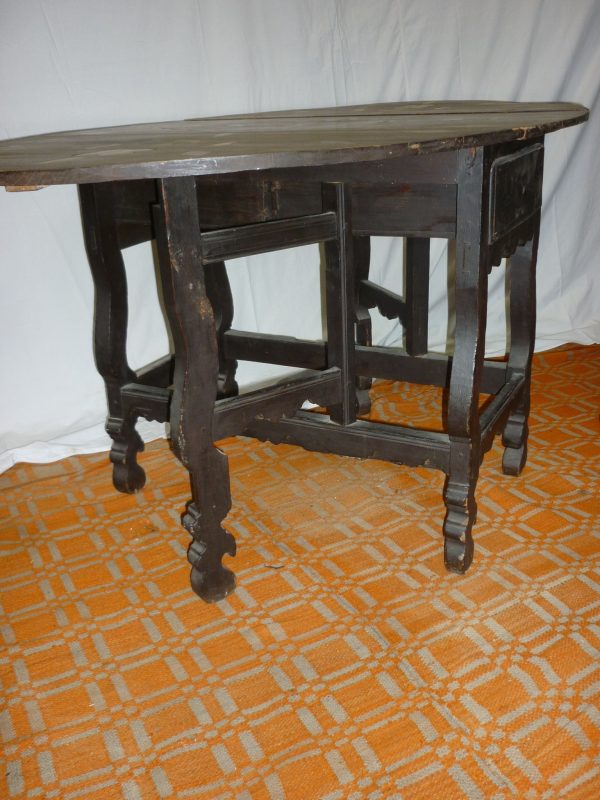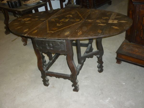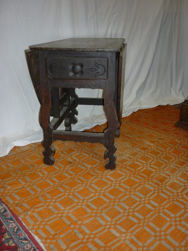 Gambe a lira mistilinee, due cassetti con frontale intagliato, traversa e grembiule sagomati e gambe laterali richiudibili.