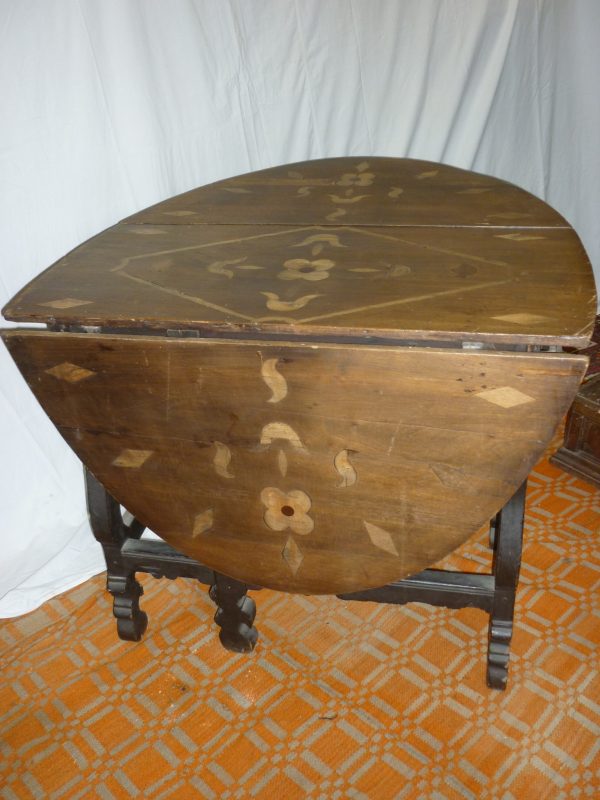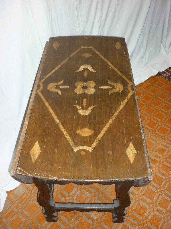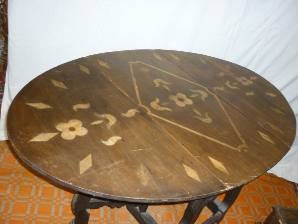 Tavolo da pranzo o da appoggio con piano e bandelle in castagno intarsiati. Le tarsie a motivi floreali e vegetali in legno chiaro di gattice.