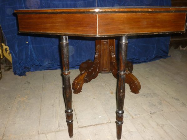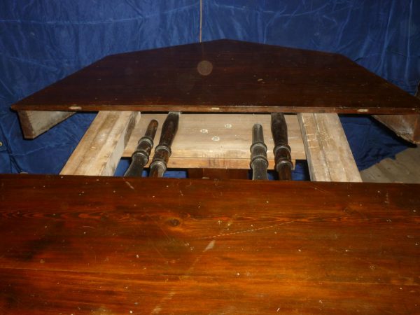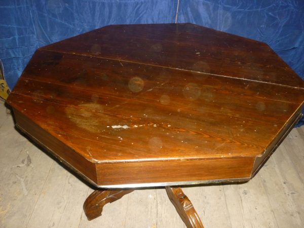 Tavolo da pranzo allungabile con piano ottagonale in larice, gamba centrale ottagonale in noce, con piedini torniti a scomparsa a sostegno del piano allungato.